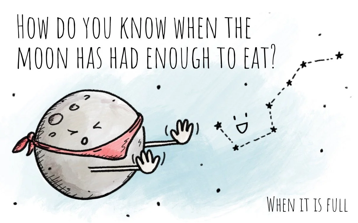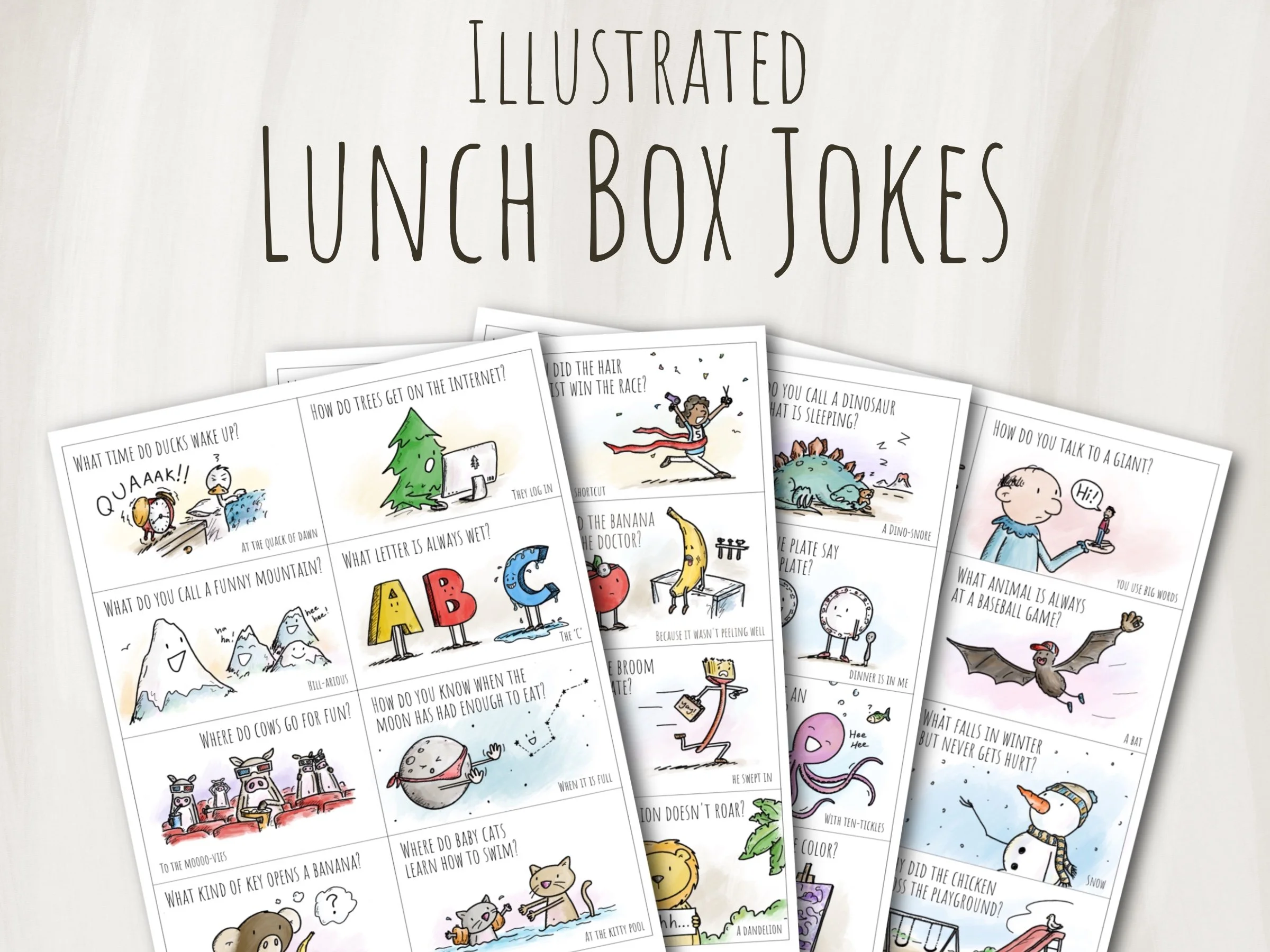 I originally created these to put in my own kids’ lunches, and they turned out to be a huge hit in both of their classes. The first step was to compile a list of jokes that were funny, would be fun to draw, and that both my 8 year old girl and my 5 year boy would understand. Hundreds of jokes later I finally curated a tight list if 32 kid-friendly funny jokes. The next step was to come up with ideas, draw, and colour all 32 jokes. A few weeks and many hours later the set is complete, and I couldn’t be happier with how they turned out.