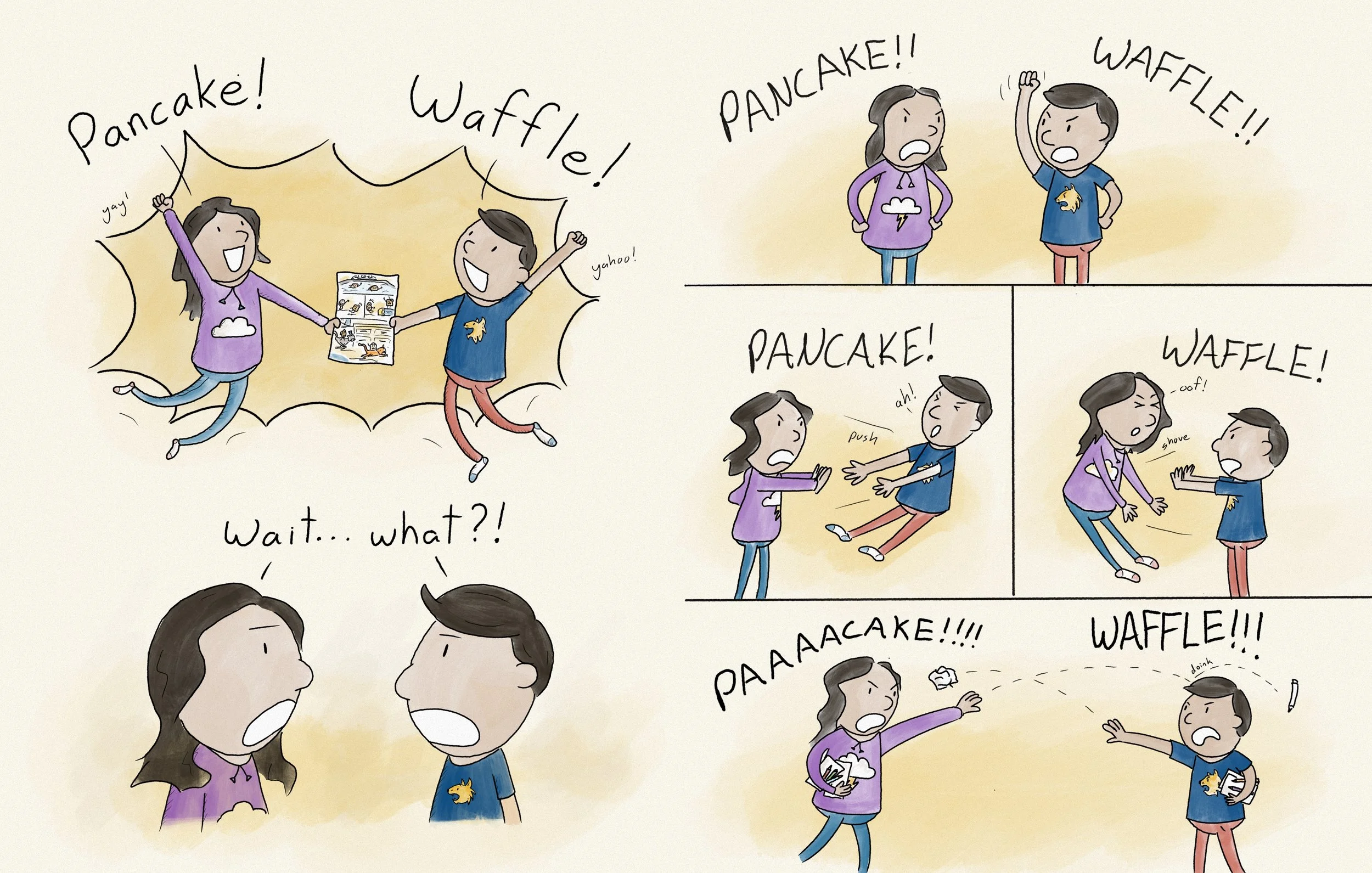Last year I did a few writing workshops at this same school, where the students and I came up with an outline for a story, including introduction, the plot points, and the ending, and then I illustrate one page for the story. One story which has become somewhat legendary was Pancake vs Waffle, a story about two breakfast foods competing to see who is the best while making a big mess of themselves (and the kitchen) in the process. The page I illustrated featured pancake and waffle racing around the kitchen riding on cats. In the end, the family comes down for breakfast, and when they see pancake and waffle they say ‘Eww, we’ll just have crepes”.